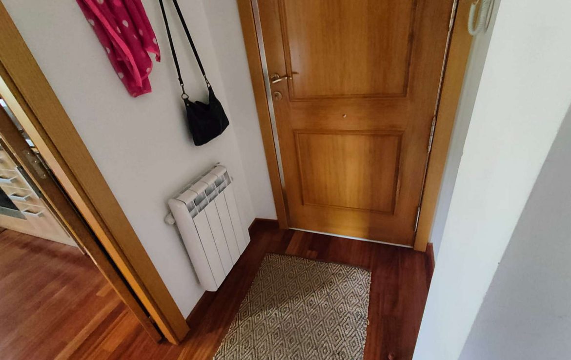 The property, situated on the second floor with elevator, offers a practical and comfortable layout with three bedrooms, two bathrooms, and a bright living area that invites relaxation. Parquet flooring adds warmth throughout, complemented by a pellet stove and electric heating to ensure year-round comfort.